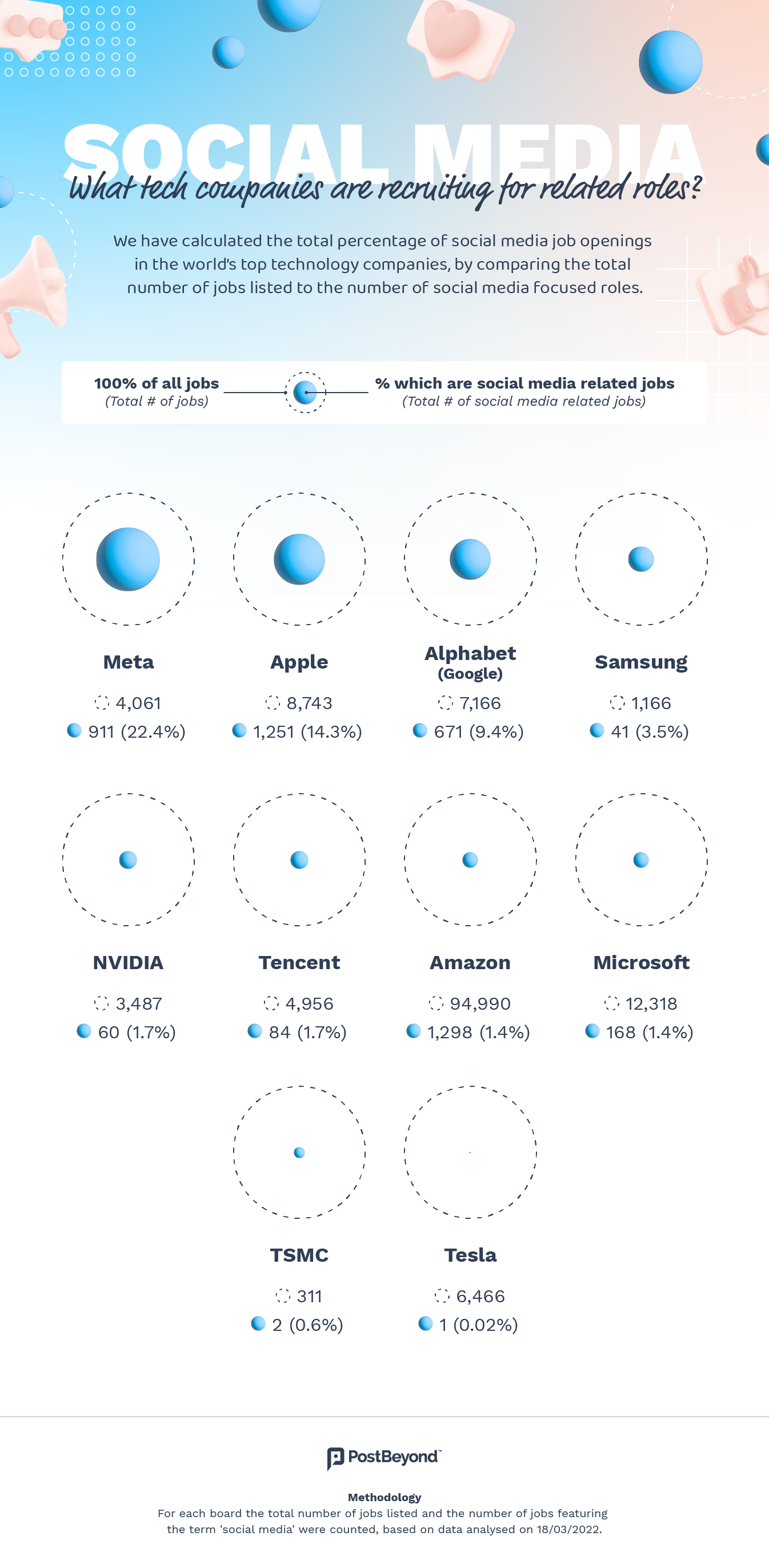 We have searched the job boards of the world’s top technology companies to discover who has the most available roles featuring social media. By comparing total job openings, to the number of social media focused roles we have calculated the total percentage of social media job openings.